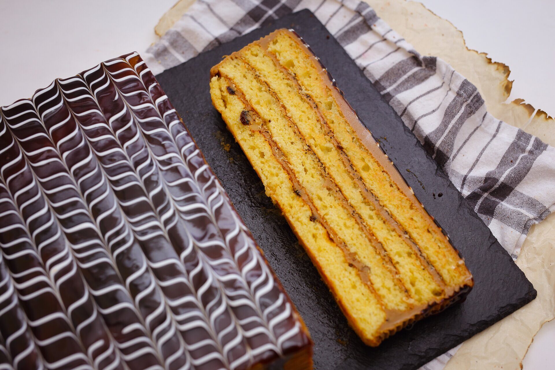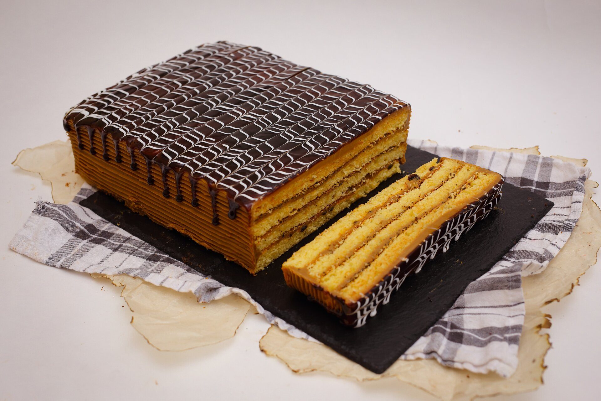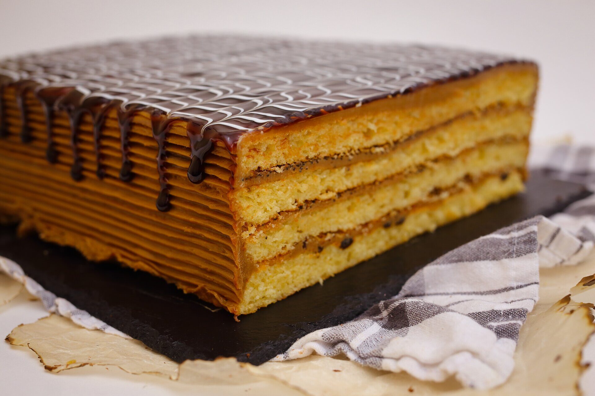 Состав: мука, сахар, яйцо, масло подсолнечное, мак, орех грецкий, изюм, масленный крем, вареное сгущенное молоко, арахис