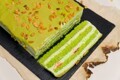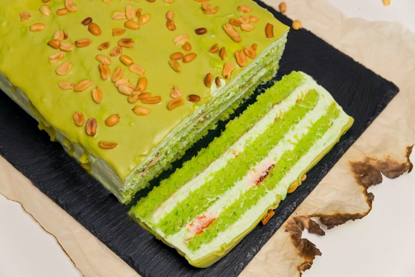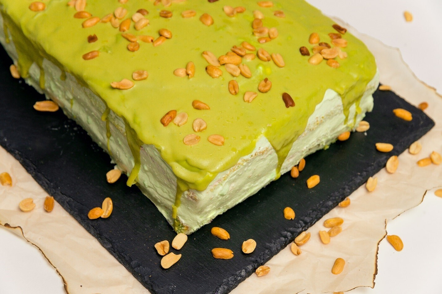 Фисташковый бисквит, начинка сливочно – фисташковая с кусочками клубничного джема, фисташковое покрытие.