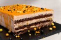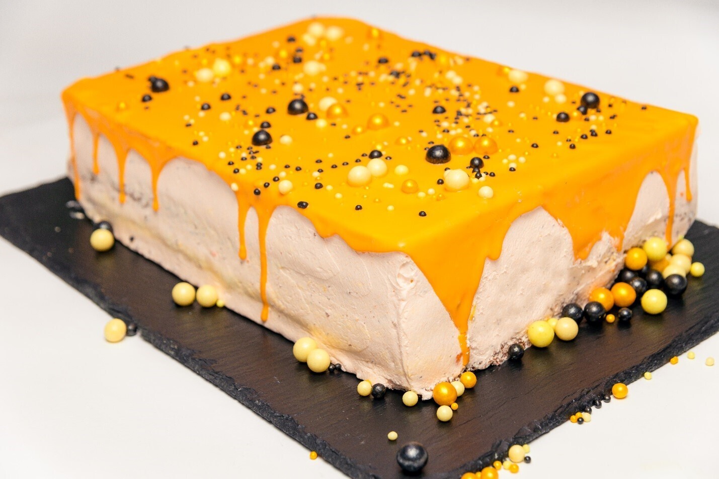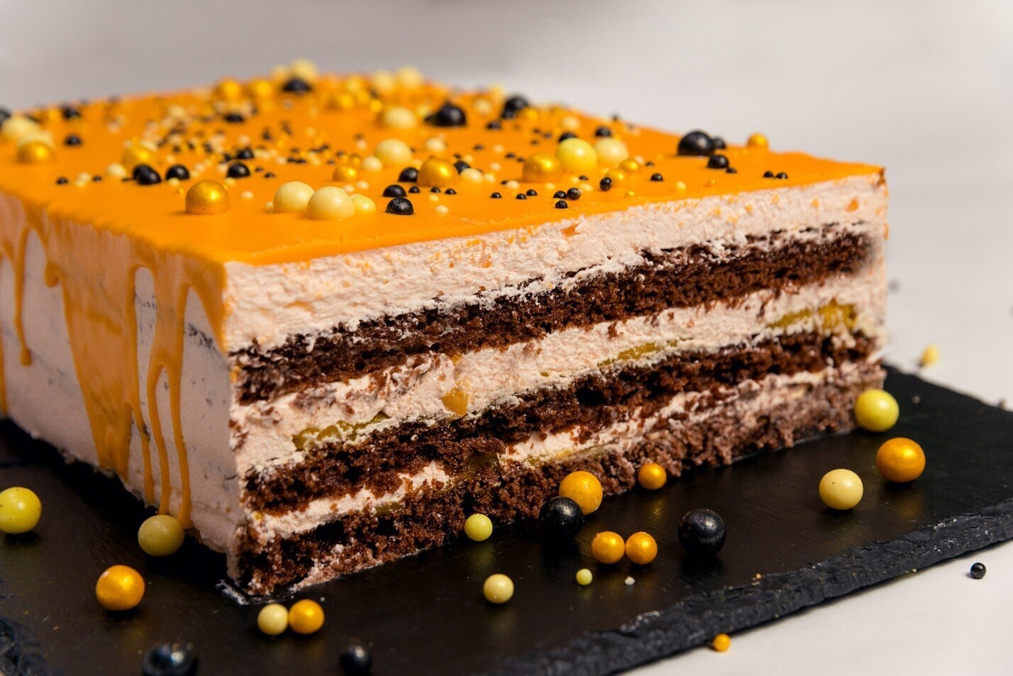 Шоколадный бисквит, апельсиновая начинка, крем манго – маракуйя с кусочками персика, шоколадно – апельсиновое покрытие.